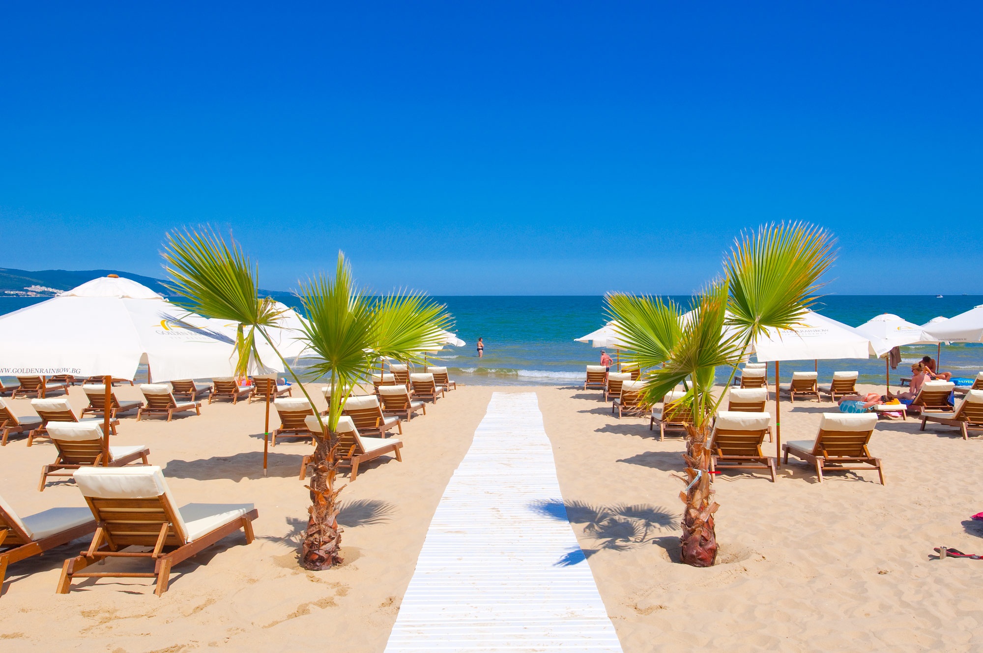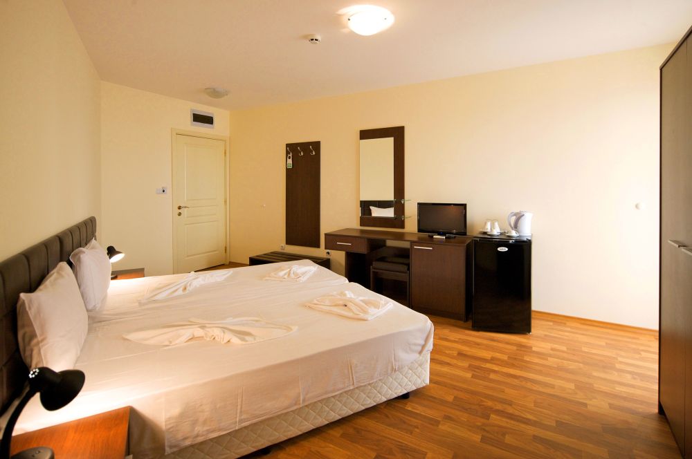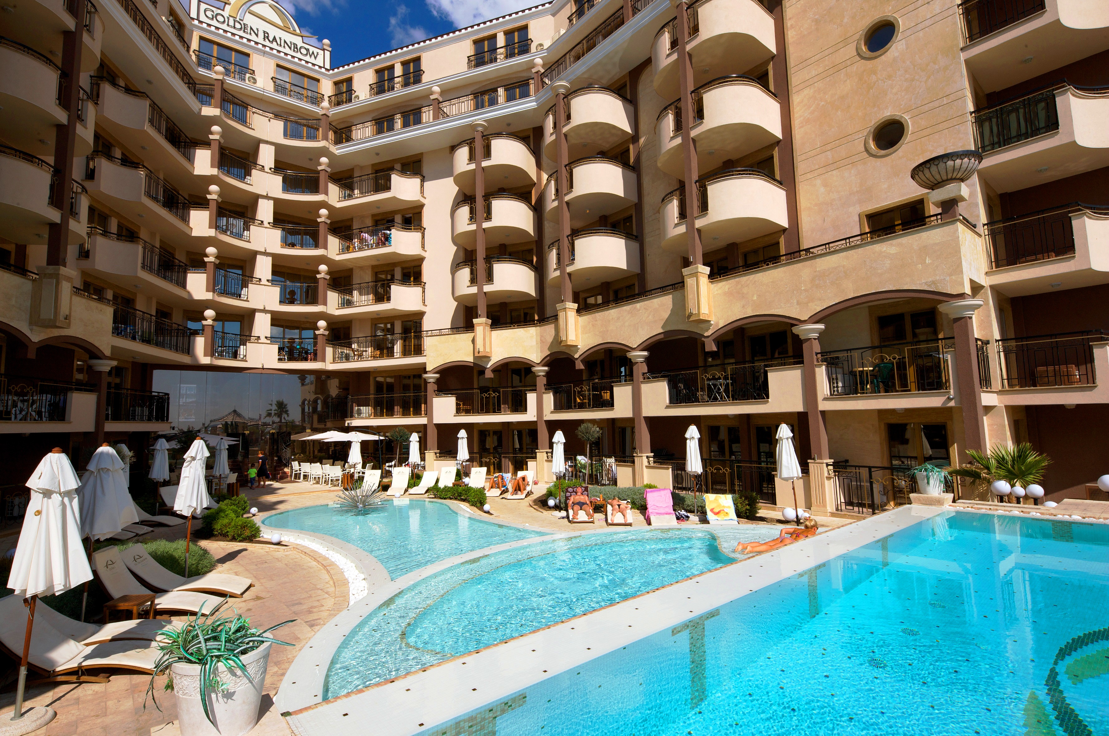 Az épület elegáns mediterrán stílusban épült, az apartmanok és a szobák 90%-ka tengerre néző, lélegzetelállító kilátással rendelkezik. A szálloda Napospart csendes részén helyezkedik el, a dűnék által határolt finomhomokos strandon. A vendégek rendelkezésére áll az aparthotel medencéje, az allinclusive ellátás a szálloda éttermében és koktélbárjaiban. A Golden Rainbow vendégei egyedül álló módon élvezhetik a jól megérdemelt pihenésüket, hódolhatnak az önfeledt kikapcsolódásnak a part és tenger közvetlen ölelésében, ami egészen biztosan magával ragadja önöket is!!! A szálloda recepciójánál, folyamatosan magyar személyzet is a vendégeink még komfortosabb pihenését segítik!