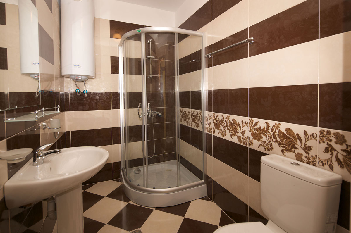 - бани: душкабини, електрически бойлери, теракота, фаянс, мивка, WC с моноблок, батерии - смесители в душ-кабините и мивките, вентилатор в отдушника, аксесоари